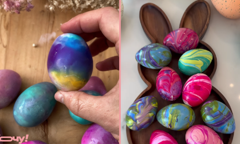 Есть немало способов оригинально покрасить яйца на Пасху. Мы рассказывали, как сделать “леопардовые пасхальные яйца”. Теперь расскажем, как украсить их цветными разводами.