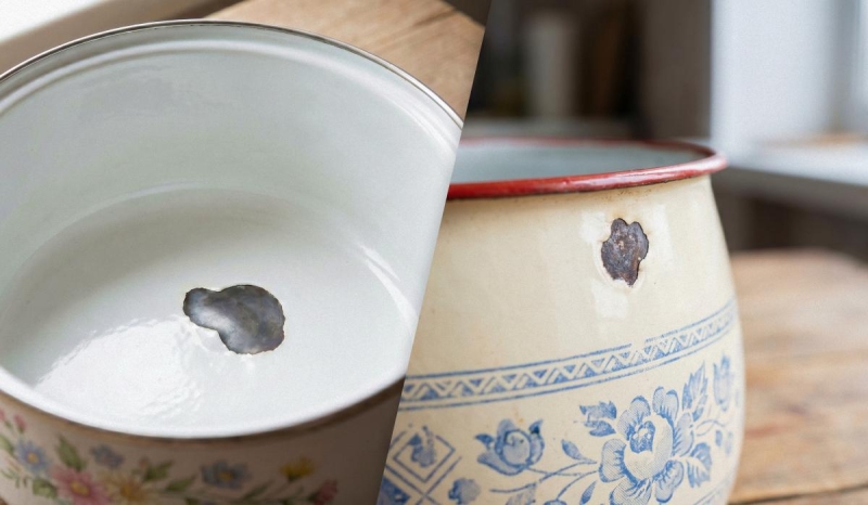 Коли на емальованій каструлі, відрі або мисці з’являється відкол, це не тільки “некрасиво” – пошкоджене місце оголює метал, і він, стикаючись з вологою та повітрям, потихеньку іржавіє. Згодом іржа може проникнути глибше, і в результаті з’явиться дірка.