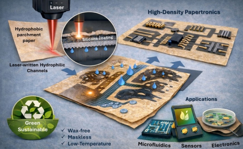 Точна обробка паперу лазером дозволяє вибірково видаляти це покриття за відповідними схемами, оголюючи целюлозні волокна, що вбирають воду. Створені лазером крихітні канали заповнюються чорнилом на водній основі, формуючи резистори та конденсатори саме там, де це потрібно, а також міжз’єднання та аналогові схеми.